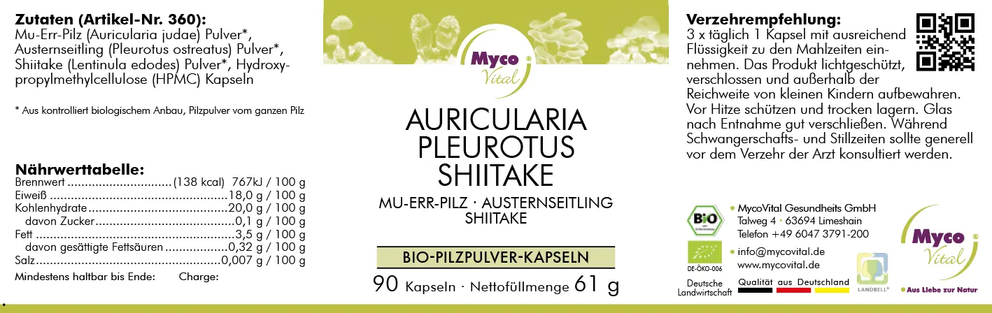 Take 1 Auricularia-Pleurotus-Shiitake capsule 3 times daily with meals and plenty of fluids. Store the product protected from light, sealed and out of the reach of small children. Protect from heat and store in a dry place. During pregnancy and breastfeeding, a doctor should generally be consulted before consumption.