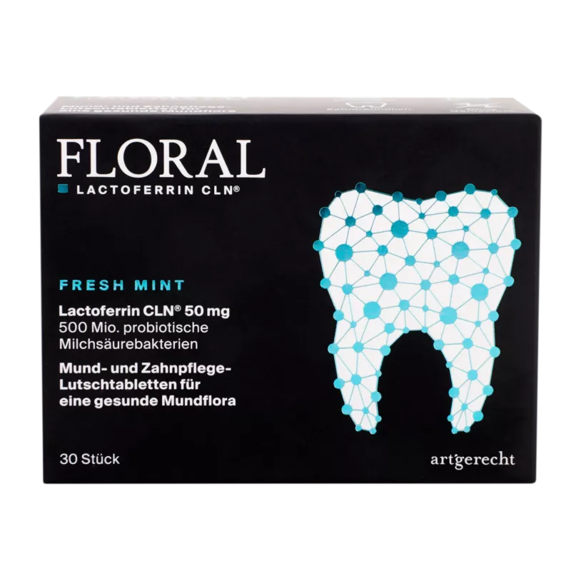 FLORAL Mund- und Zahnpflege-Lutschtabletten mit ihrer einzigartigen Zusammensetzung aus hoch aufgereinigtem Lactoferrin CLN® und spezifischen Milchsäurebakterien fördern eine gesunde, ausgeglichene Mundflora und beugen den o.g. unangenehmen Folgen eines bakteriellen Ungleichgewichts vor.
