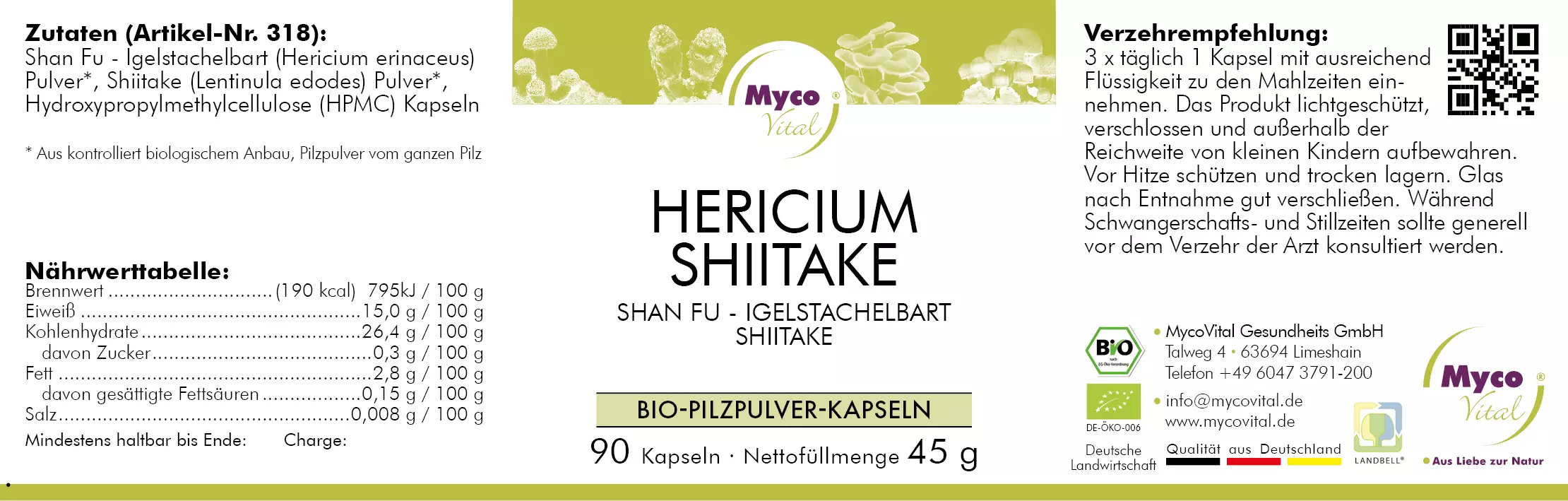 Jede Charge unserer Hericium-Shiitake Bio-Pilzpulver-Kapseln wird unter strengen Qualitätsstandards hergestellt. Die Verpackungseinheit enthält 90 Kapseln, was einer Nettofüllmenge von 45 g entspricht (500 mg pro Kapsel). Damit fügen sich die Kapseln mühelos in Ihren täglichen Ernährungsplan ein.