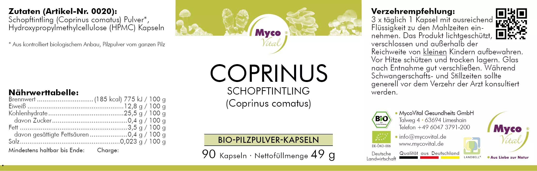 La coltivazione e la trasformazione in capsule di polvere di fungo avvengono completamente ed esclusivamente nella nostra azienda a Limeshain, Germania. Il fungo maturo, appena raccolto, viene immediatamente essiccato dopo la raccolta con il nostro speciale processo di essiccazione delicato, macinato delicatamente in polvere con un mulino raffreddato ad acqua e incapsulato in capsule HPMC. Non avviene alcun stoccaggio intermedio (ad esempio in celle frigorifere). Grazie alla lavorazione immediata, rapida e delicata, garantiamo che tutti gli ingredienti importanti siano preservati e che il fungo non perda le sue proprietà naturali e utili per l’alimentazione umana. Possono essere presenti tracce di miglio. (Clicca qui per guardare il nostro video di produzione)