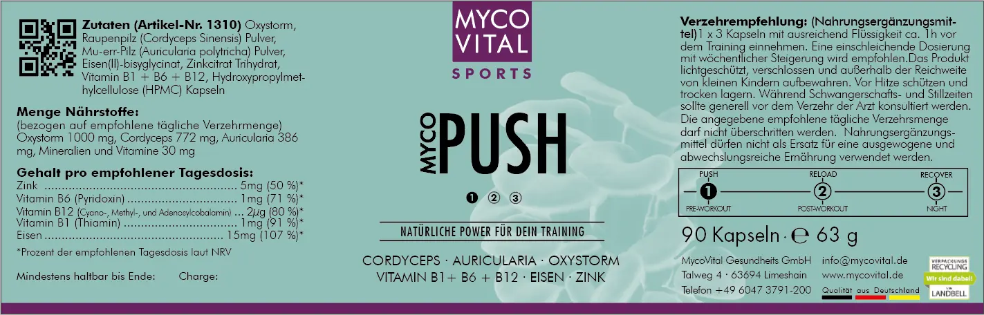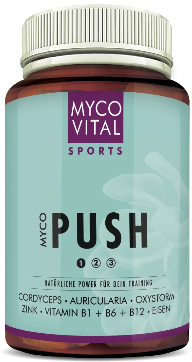MYCO PUSH basiert auf Bio Vitalpilzen und ist speziell für Sportler und deren Bedürfnisse zusammengestellt. Mit diesem außergewöhnlichen Partner hast du die Kraft und Ausdauer, neue Bestleistungen zu erreichen. Der Booster ist frei von Koffein, verringert die Laktatbildung und erhöht das Sauerstoffvolumen, was die Ermüdung der Muskeln verringert. Die Sauerstoffzufuhr und Durchblutung wird gesteigert und somit kannst du länger und häufiger trainieren.