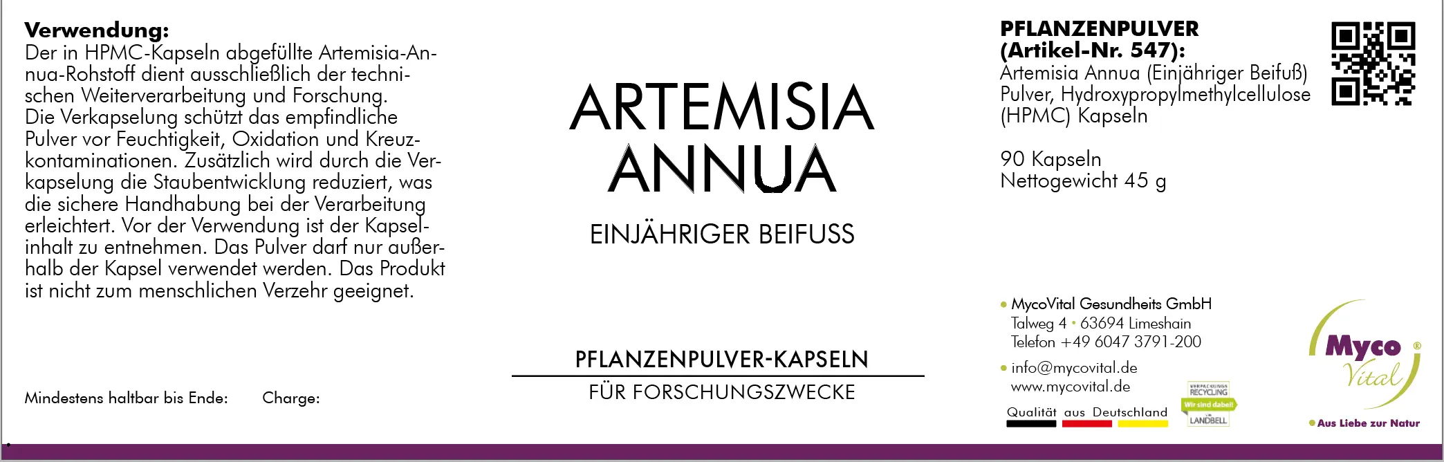 Der in HPMC-Kapseln abgefüllte Artemisia-Annua-Rohstoff dient ausschließlich der technischen Weiterverarbeitung und Forschung.