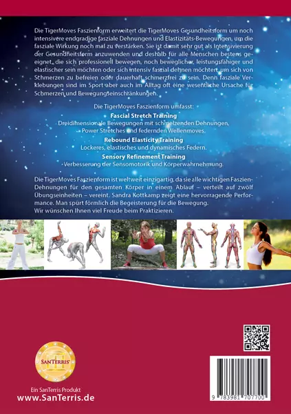 Die TigerMoves Faszienform ist weltweit einzigartig, da sie alle wichtigen Faszien-Dehnungen für den gesamten Körper in einem Ablauf – verteilt auf zwölf Übungseinheiten – vereint. Sandra Kottkamp zeigt eine hervorragende Performance. Man spürt förmlich die Begeisterung für die Bewegung.